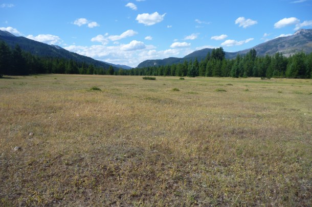 Behind the cabin and up a small hill was a big meadow. It was quite a contrast to see such a broad, level spot after hiking so close to the river. The grass had dried up, but it was still very photogenic. I could envision deer and elk grazing there in the spring when everything was green. Bill’s horses and mules also wandered up there to run around. Views like this are what earned Montana the nickname of Big Sky Country.