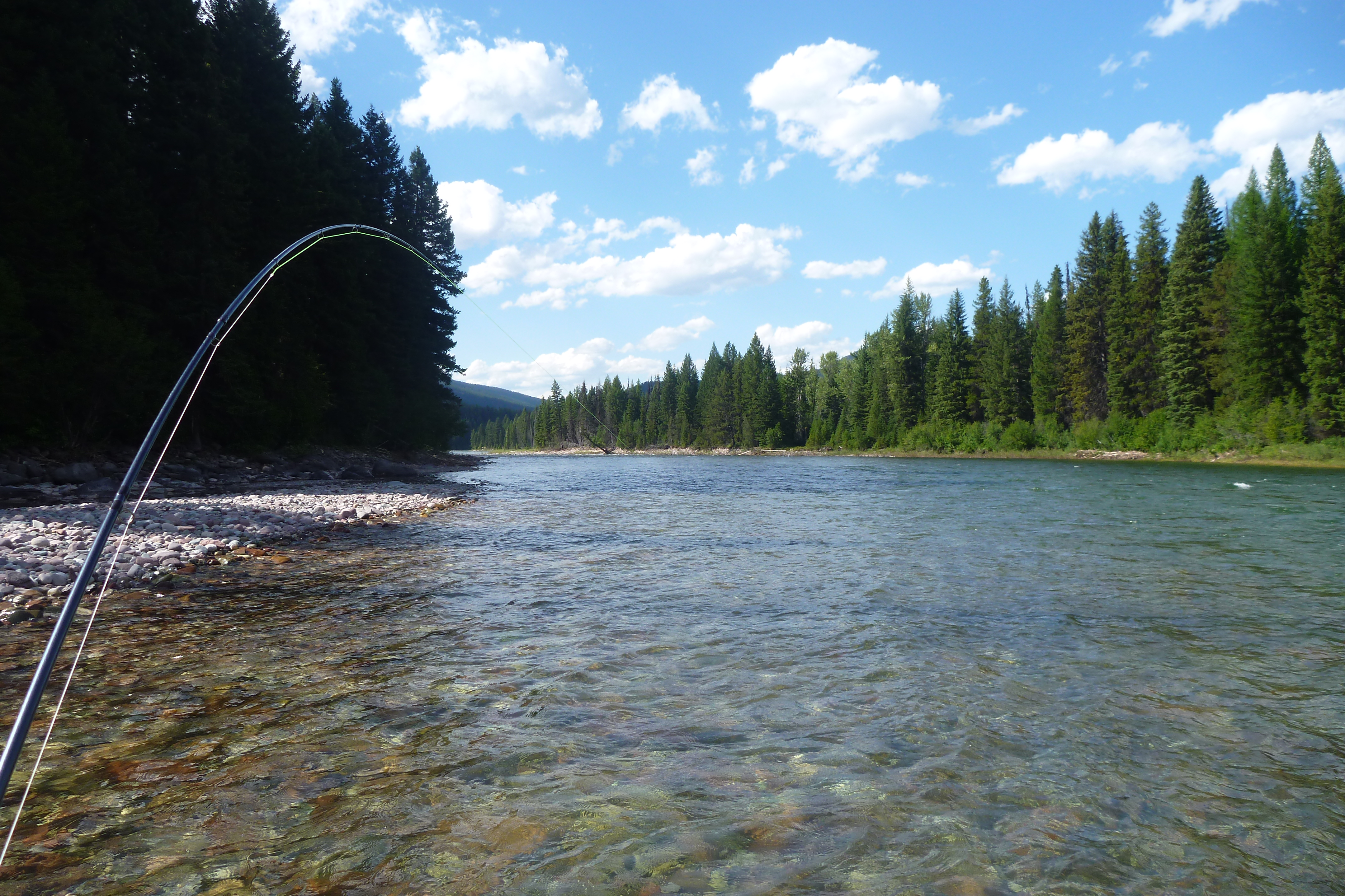 I walked a little further downstream and sat down on a steep bank to replace my tippet. While I was tying knots a group of 4 rafters landed upstream 80 yards on the other side of the river. I presume one was a guide taking the other three on a float trip. They waded in to their knees and fished a channel ten yards in front of them. Most of them didn’t look too serious, but one guy was a real technician. I watched him as he carefully placed his caddis fly upstream and mended his line as he followed it through a drift. I was a little surprised when he caught two fish in that small section of water. Both were only about six inches, but I still wouldn’t have guessed there was anything there. It inspired me to try some unlikely places. With the wind at my back I casted out into the river and slightly upstream. I was using a prince nymph under a red humpy with my thingamabobber setup. At the end of a drift the indicator disappeared underwater and I felt a strong tug. I set the drag on my reel and started to bring it in. But he really wanted to run and I was careful not to snap the leader. Despite continuously tightening the drag, he still kept peeling line and heading downstream. When he got to the backing I knew I needed to start fighting harder.