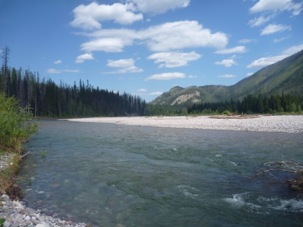 As I was packing up after breakfast I saw four fishermen come across the bridge and follow the trail behind the cabin. They all had fly rods and packs so I guessed they had the same idea I did. The Flathead is a very big river, so I wasn’t worried about overcrowding. They waved to me and disappeared into the forest. I didn’t leave for another half an hour, which turned out to be a good strategy.