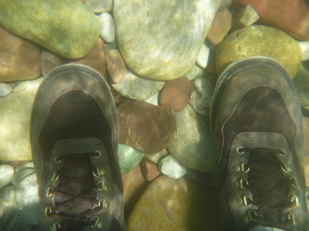 The water was crystal clear. My camera is waterproof so I took a couple underwater photos. It doesn’t do so well beyond a few feet, but it still did a good job of capturing the clarity. I could see my boots just as clear underwater as I could on land! I was tempted to drink the water right from the river (and I did in other places) but I saw some signs of beaver activity near the bank. Beavers are known to be carriers of giardia, a microscopic protozoon that infects the small intestine. Getting sick in the wilderness is a whole new kind of miserable. My water filter will strain out giardia, so I filtered all the water I drank from the river.